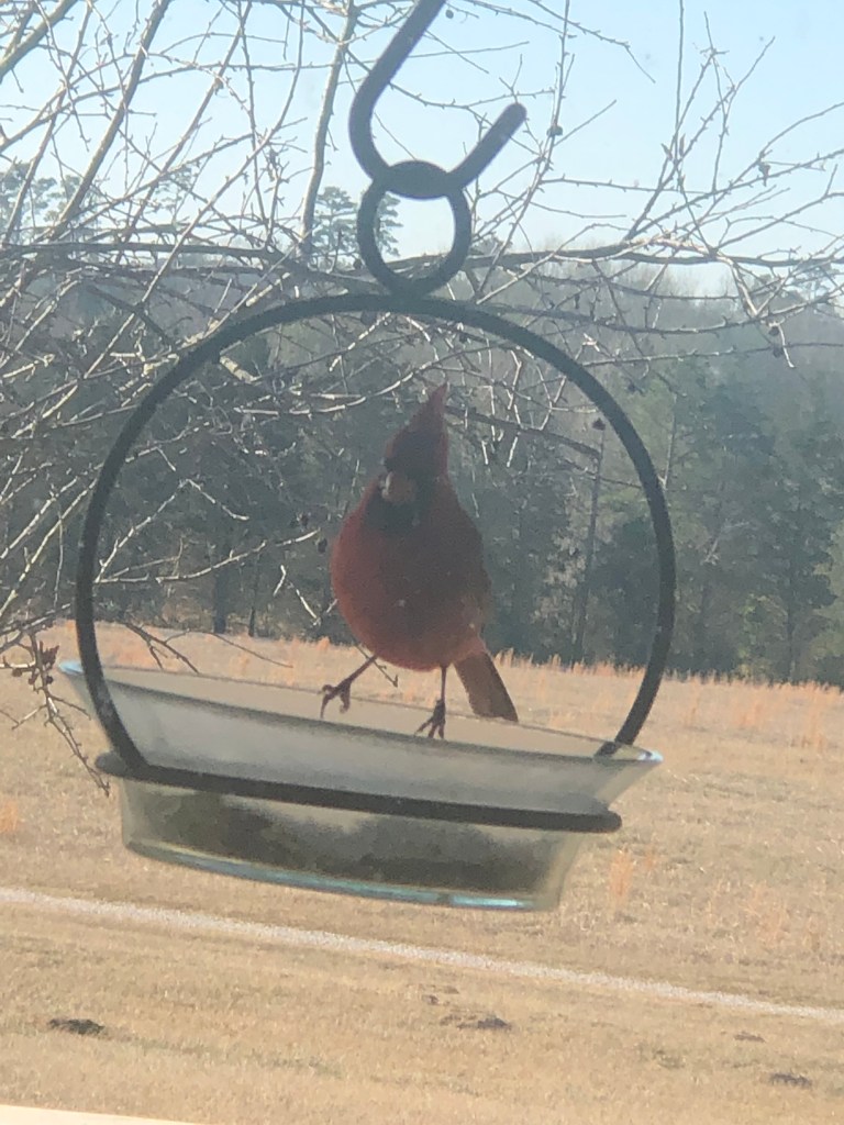 First thing every morning, I go for a cup of coffee. Then I open the blinds next to my computer. Today, I was greeted by a cardinal in my birdfeeder. You know what they say about cardinals, don’t you? That they appear when angels are near and represent loved ones who have passed away. They are messengers from Heaven who deliver words of love and comfort during difficult times. I always think of my husband when I see them. It’s been nearly eight years since he died, and I still miss him every day, but I can smile when I see a cardinal because it makes me feel like he’s near.